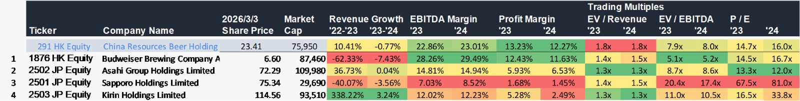 公司核心業務展現穩健的現金流與防禦性特質,使其在宏觀經濟波動環境下,仍能維持優秀的自由現金流轉換能力。此外,與同業相比,目前華潤啤酒的 EV/EBITDA 及 P/E 等估值倍數略低於行業平均水平,反映市場對其短期增長動能及消費環境仍持相對審慎態度。